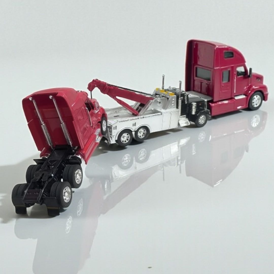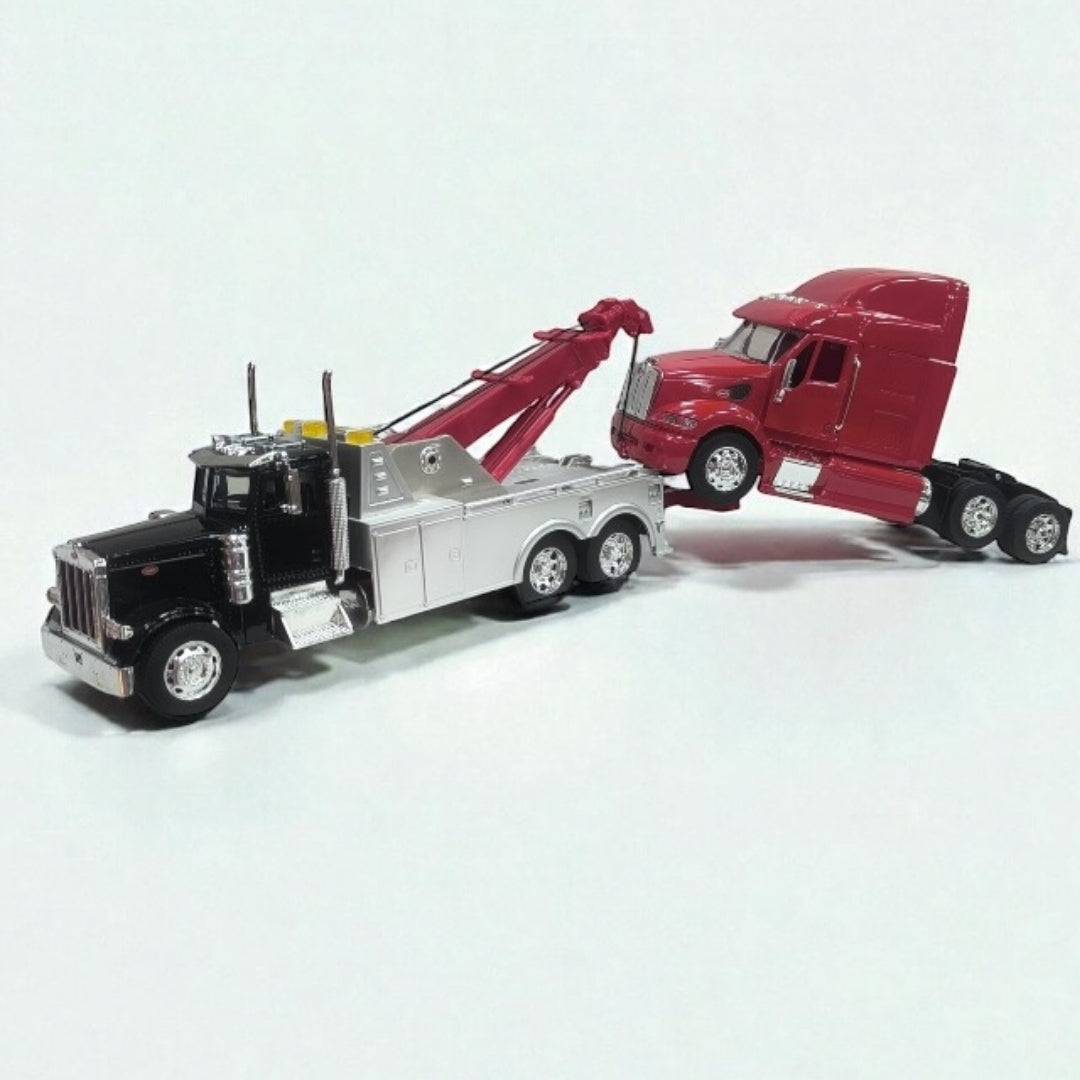 El set Grúa Peterbilt 379 y Cabezal Peterbilt 387 a escala 1:32 reúne dos referentes del transporte pesado americano en una sola colección. Por un lado, la grúa Peterbilt 379, diseñada para rescate y remolque de camiones y maquinaria pesada; por el otro, el cabezal Peterbilt 387, símbolo de eficiencia, aerodinámica y transporte moderno de larga distancia.