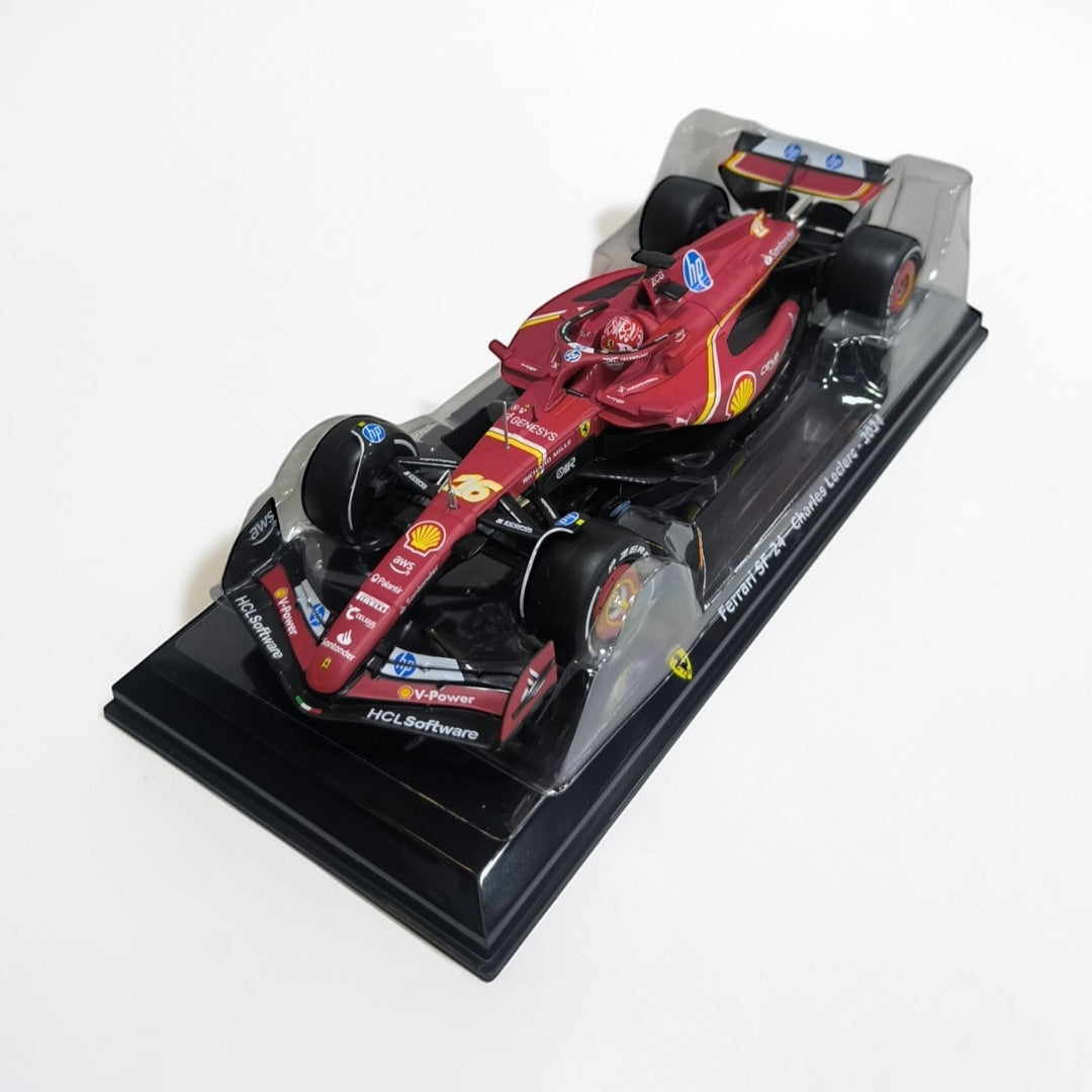 Esta réplica en escala 1:24 reproduce el monoplaza conducido por el piloto monegasco Charles Leclerc, identificado con el número #16. Gracias a su mayor tamaño, esta escala permite apreciar con más detalle la carrocería, los alerones y la decoración oficial del equipo Ferrari.