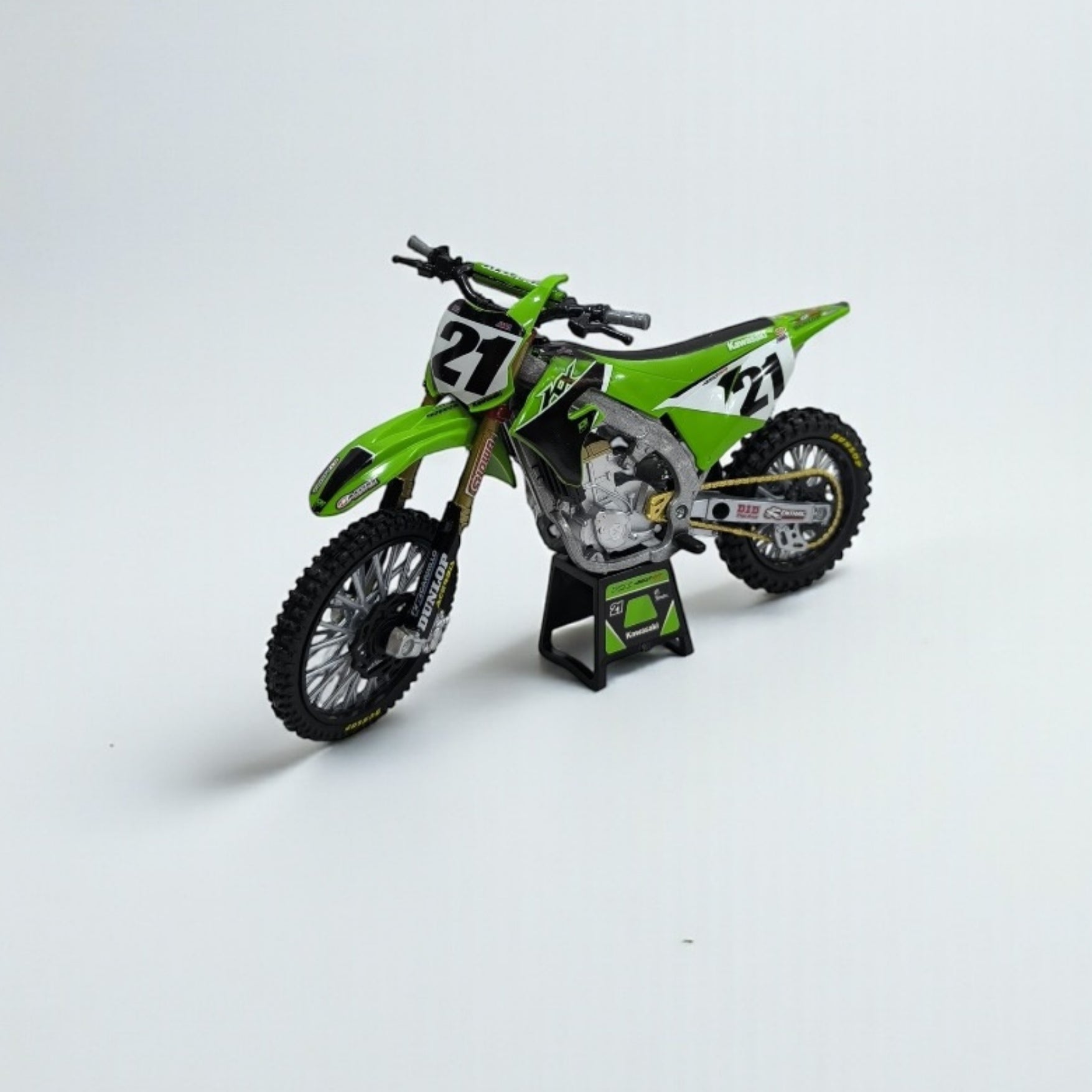 La Kawasaki KX 450 SR Jason Anderson a escala 1:12 está inspirada en una de las motos más agresivas y competitivas del motocross profesional. Esta réplica representa la máquina de fábrica utilizada por Jason Anderson, piloto reconocido por su estilo explosivo, velocidad constante y mentalidad ganadora.